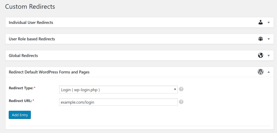 Note that the Custom Redirects add-on enables you to set up multiple redirects. Once you settle on the configuration you want, click on Add Entry. The redirect will show up in a list below the Add Entry button and you can set up additional redirects right away.
