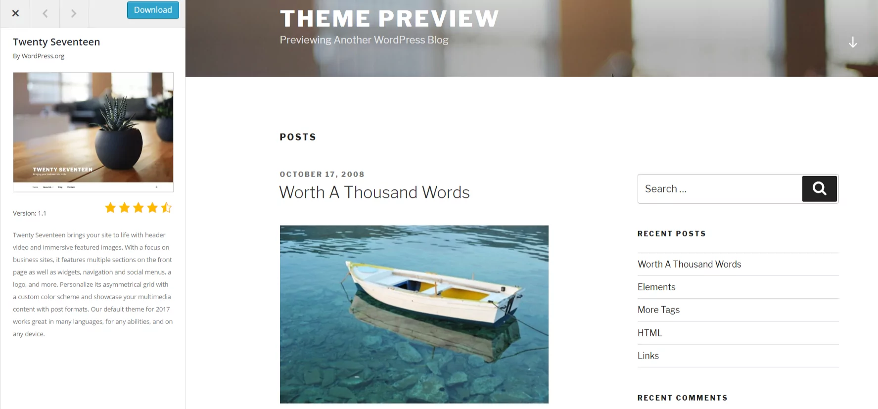 By default, WordPress comes with a default Theme, the latest being the WordPress TwentySeventeen theme. This means that when you install WordPress on your site, it’s ready to host and manage your content right away.