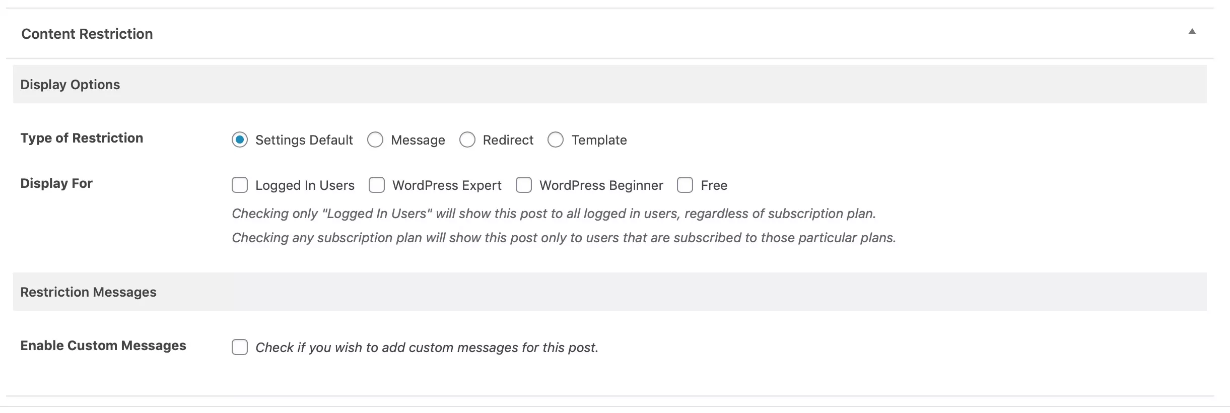 You can also set global content restriction rules with the Global Content Restriction addon. This lets you set restriction rules to categories, taxonomies, and post types. So instead of manually setting restrictions for each new post, just assign the relevant category, taxonomy term, or post type, and it will automatically be restricted.