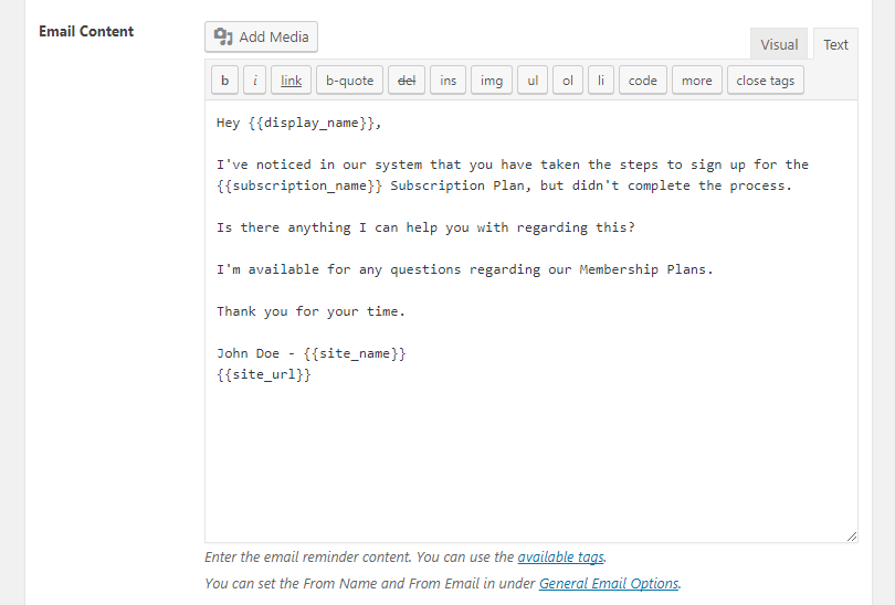 Here we set up the Email Content of our Email Reminder. We can use the Available Tags.