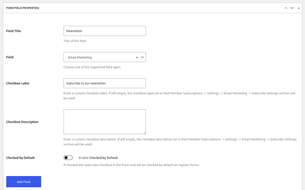 This will add a checkbox that enables your users to subscribe to your Mailchimp Newsletter using your Profile Builder Registration form.