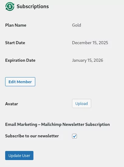 You are able to edit the Subscription Status of your members by navigating to your Dashboard → Users → All Users → edit your desired user. You will find the Subscribe to our newsletter field here.