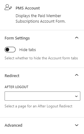 The PMS Account Block has controls for Form Settings, Redirects, and Advanced in its Content tab. In the Forms Settings section, you will have the option to show or hide the Account form tabs. In the Redirect section, you can select the page to which you want the users to be redirected after they log out from the Account form. And in the Advanced section, you can manually type in the Logout Redirect URL and you can add additional CSS classes.