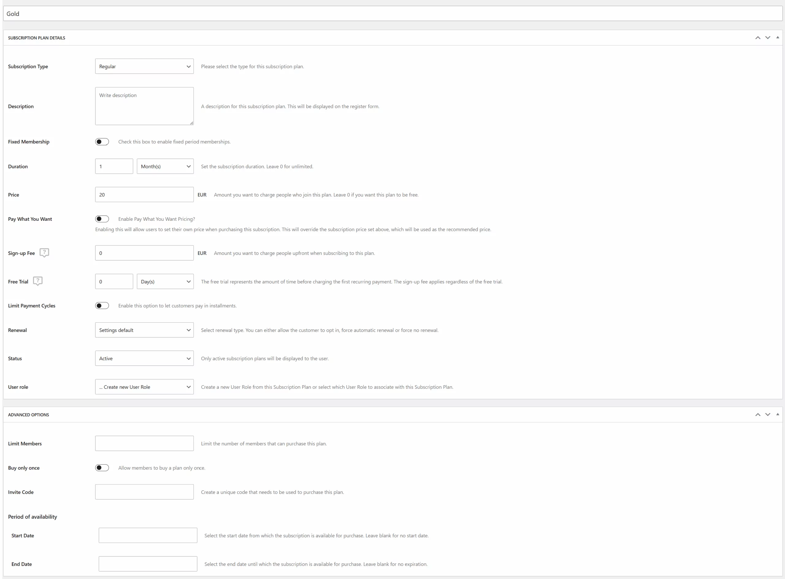 Adding a new Subscription Plan gives you access to the following options to set up:
