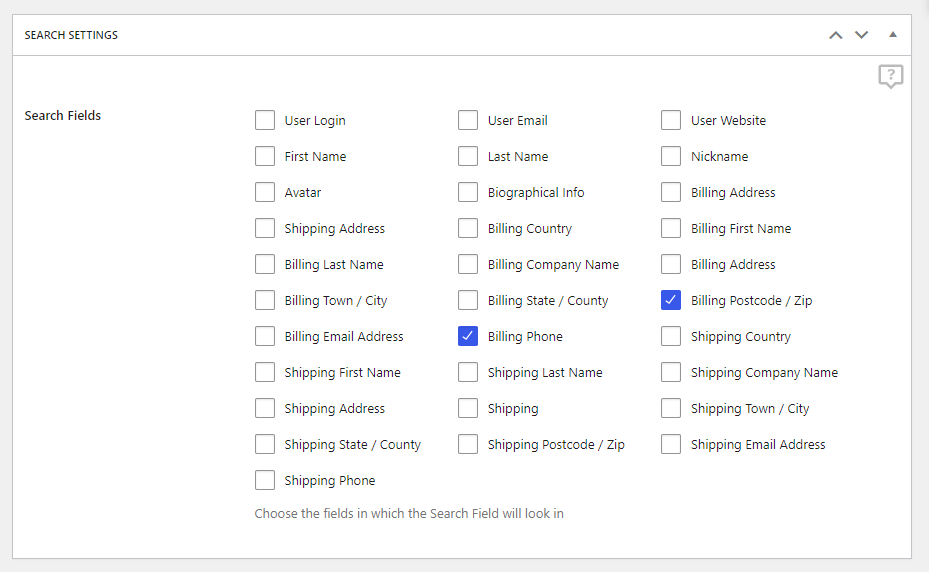In the Search Settings tab, we can set in which fields should the Search Field look into. For example, we can allow to search based on Billing Postcode / Zip and Billing Phone.