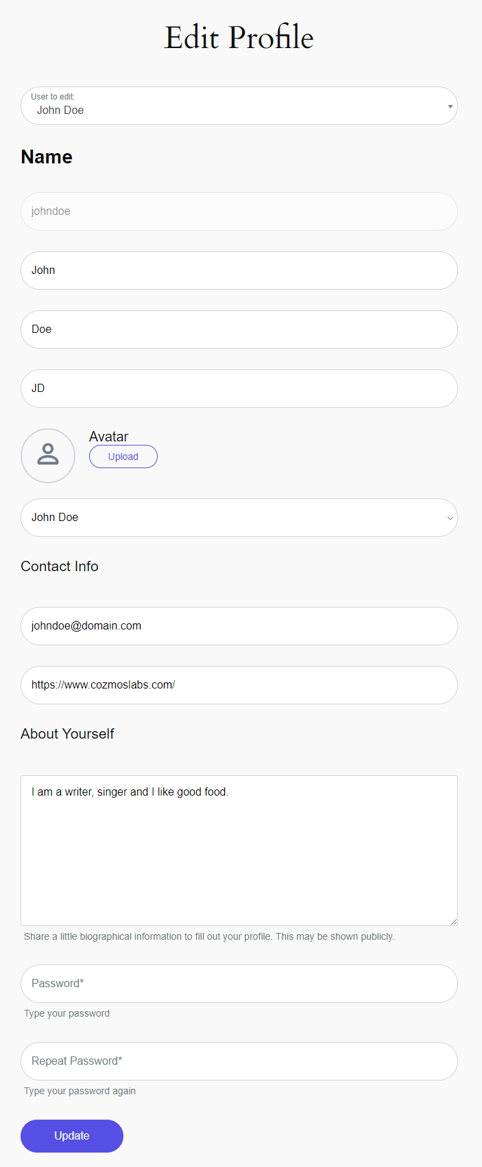 You will see a Select drop-down field called “User to edit” that you can use to select any user and edit their profile.