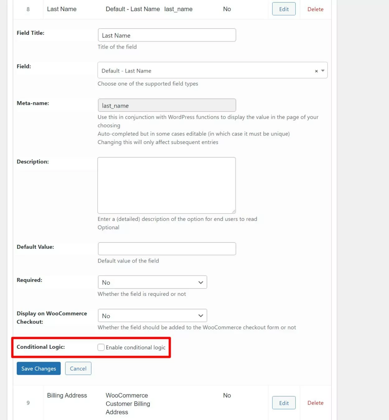 Whenyou add or edit a field, you’ll be able to configure its labels, default values, whether it’s required, etc. For advanced uses, you can also set up conditional logic, which lets you show/hide certain registration fields based on how users have answered previous fields: