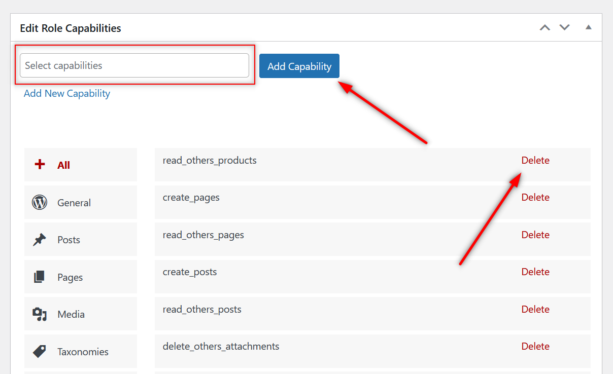 Simply click on the Delete link beside the permissions you want to remove for your Editor user role. Similarly, click on the Select capabilities field and a list of all the capabilities will pop up.