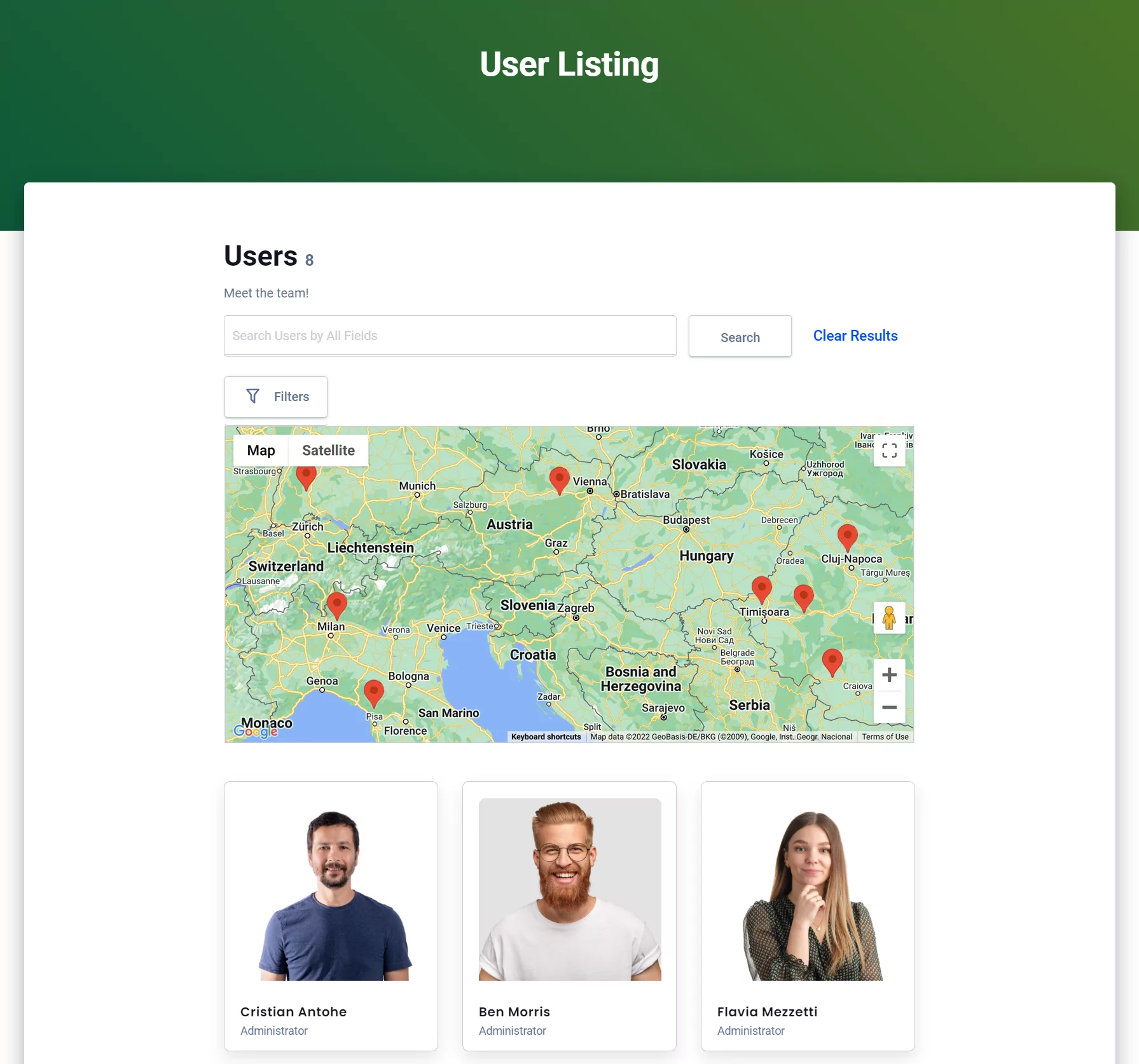 You can use it to list all the users inside the user listing. It also makes it easy to search for users by entering a search term or filter them based on different information. Essentially, it works with the User Listing module to extend the functionality of your map.